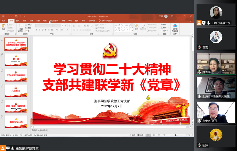 12月7日晚,新利18官方客服刑事司法学院教工党支部与上海市中医医院急诊党支部联合举办“学习贯彻二十大精神,支部共建联合研修新《党章》”主题党日活动。刑事司法学院教工党支部与上海市中医医院急诊党支部全体成员参与。上海市中医医院急诊与重症医学科主任、上海市中医医院急诊党支部书记闫国良与刑事司法学院副院长、教工党支部书记王娜联合主持学习会。