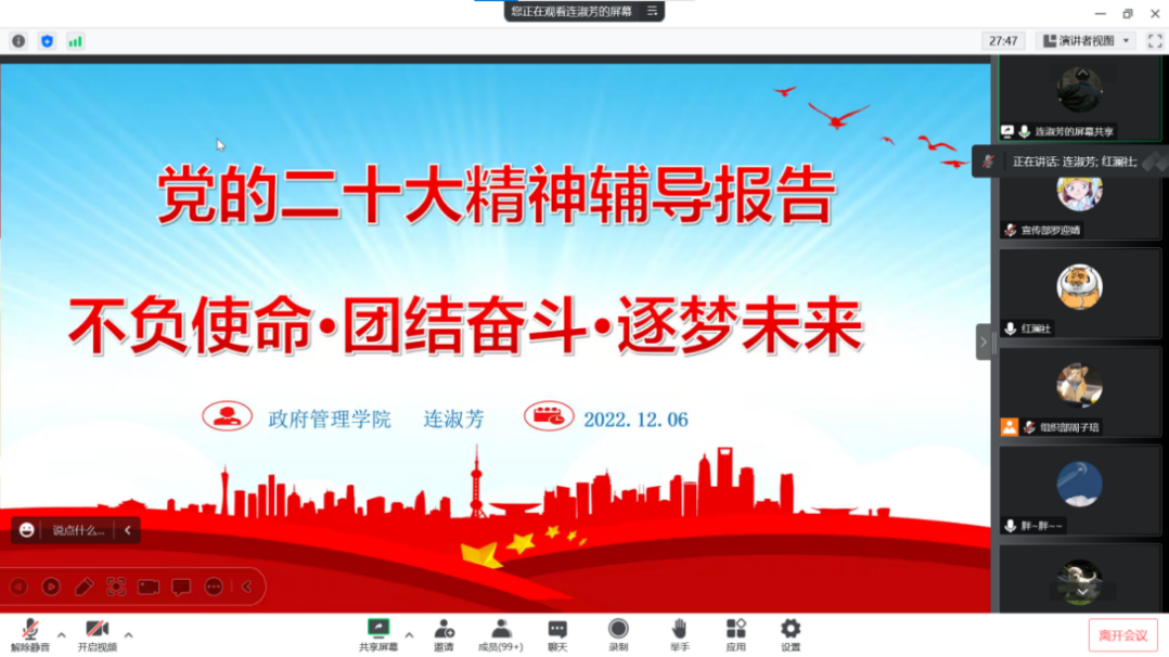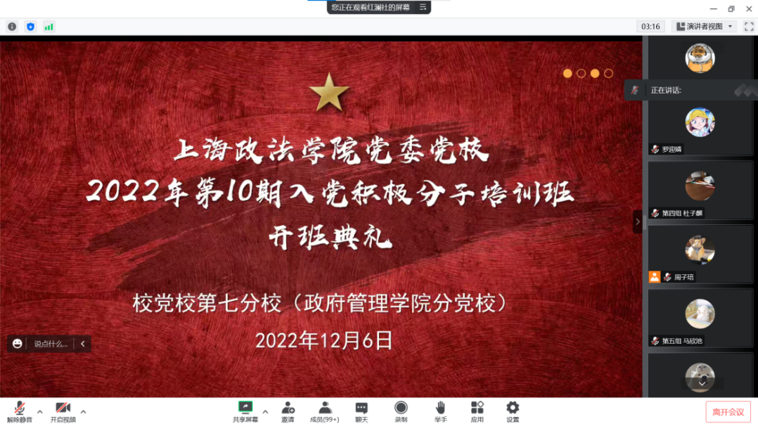 12月6日中午,校党委党校政府管理学院分党校2022年第10期入党积极分子培训班开班典礼在腾讯会议顺利举行。党总支书记连淑芳、组织员骆胖出席,第10期入党积极分子培训班全体学员参加,学院红澜社社长李菩澍主持。