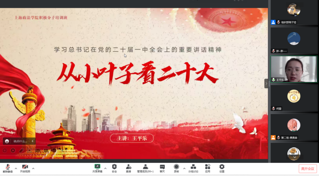 上政第35学生党支部书记王平乐作了题为“从小叶子看二十大”的支部书记微党课。王平乐围绕“品”进博会,“拾”小叶子,寻共同、谈感想三个模块开展,呼吁全体学员奉献青春力量,展示志愿服务精神。