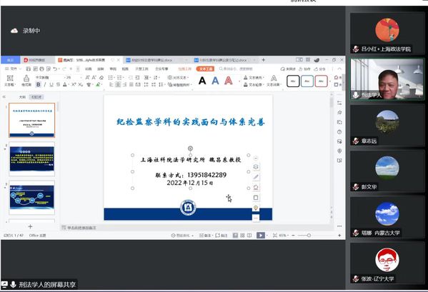 在与谈环节,华东政法大学纪检监察学院常务副院长章志远教授认为,纪检监察学科的建设要有大格局、大纪监、大法治的观念,要站在党自我革命引领社会革命的角度,以全局性、整体性的思路看待学科建设。云南师范大学法学与社会学学院院长兼云南纪检监察学院执行副院长尤伟琼教授提出,纪检监察学是交叉学科,在建设的过程中要注重政治学的方向指引、法学的理论指引、社会学的时代指引、教育学的方法指引、管理学的系统指引。内蒙古大学法学院教授、监察官培训学院副院长塔娜指出,在纪检监察学科建设中,基础理论要进行清晰、符合逻辑的定位,要兼顾理论性和实践性。辽宁大学纪检监察学院副院长、辽宁省监察官学院副院长张波认为,纪检监察学科建设要以党的创新理论为指导,从人才培养、纪法衔接,实践性和历史性维度进行纵深探索。