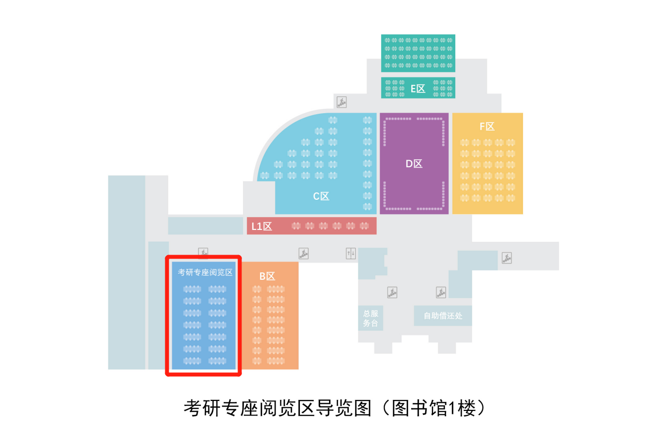 考研专座阅览区设置在图书馆一楼座位预约A区(靠近电子阅览区),共196个座位。一经预约,学生在本期座位使用时间内可以固定座位保持不变。