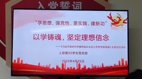 4月25日,上政第20学生党支部按照“学思想、强党性、重实践、建新功”总要求,在B3-211党员活动室开展“‘以学铸魂,坚定理想信念’——开展集中学习‘坚持全面依法治国’”主题党日活动,支部书记陈文艺主持。