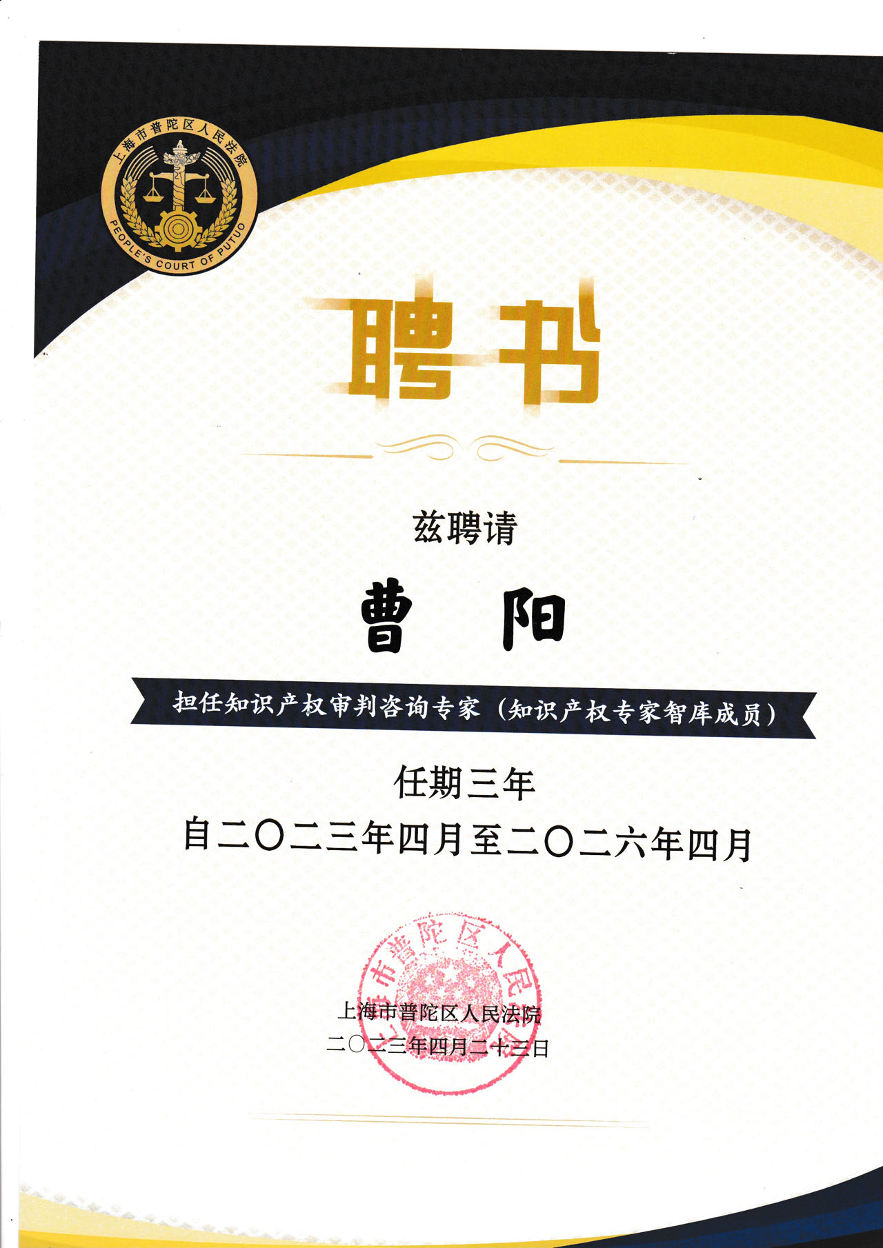 4月23日下午,曹阳教授受邀参加由上海市普陀区人民法院主办的“多元协同全链保护,打造知产保护新高地”加强知识产权保护主题活动周系列活动启动仪式,以专家智库助推知产审判专业化。曹阳教授受聘为“知识产权司法保护专家智库”首届知识产权审判咨询专家。