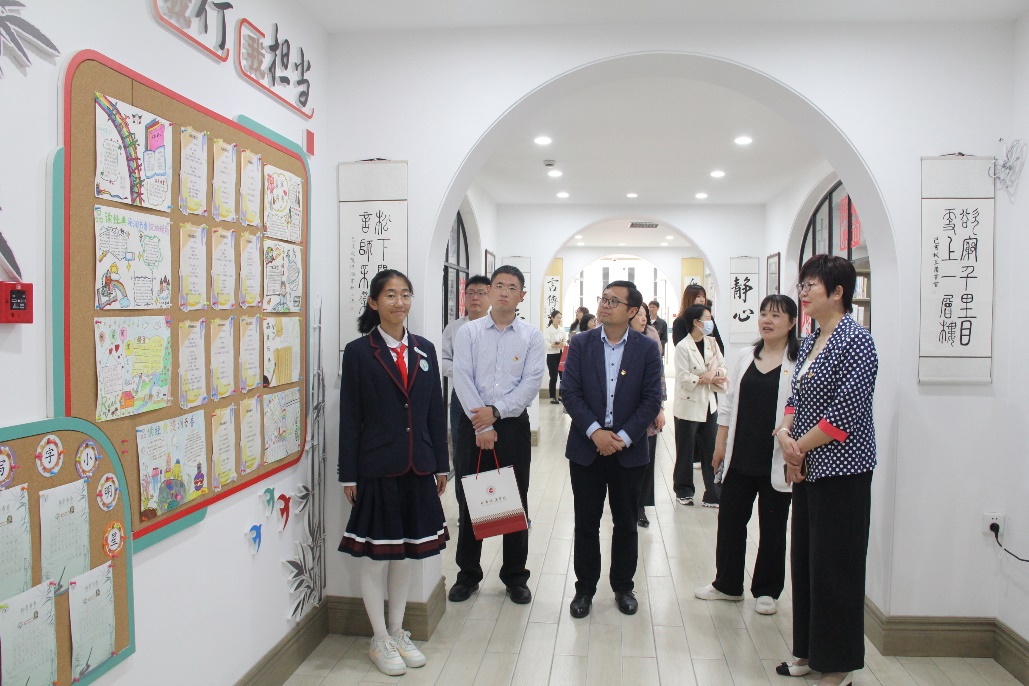 步入校园,在李燕华的带领下,王静、魏传成一行参观了学校精神文明创建成果展。陈列厅、教室过道、长廊、艺术课堂、转角博物馆,无不展现出佘外优良的校园文化氛围。图书馆内,佘外学生整齐划一的书本舞令人耳目一新,展现出青少年的活力与风采。