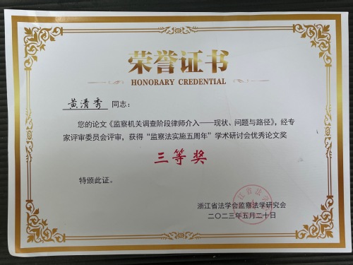 刑事司法学院22级硕士研究生(纪检监察法学方向)黄清秀同学受邀参加会议,所提交的论文《监察机关调查阶段律师介入——现状、问题与路径》荣获研讨会优秀论文三等奖。本次会议面向全国理论界、实务界征集论文134篇,经专家匿名评审,遴选出一等奖论文5篇、二等奖论文8篇、三等奖论文10篇。(黄清秀 供稿)