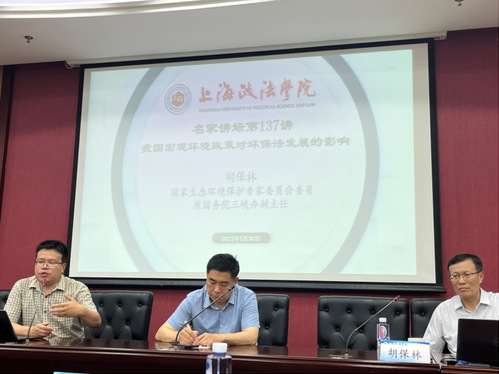 5月30日,新利18官方客服“名家讲坛”第137讲在汇知楼107会议室举办,国家生态环境保护专家委员会委员、原国务院三峡办副主任胡保林应邀以“我国宏观环境政策对环保法发展的影响”为题,作了一场生动详实的学术报告。新利18官方客服副院长郑少华教授出席并致辞,讲座由科研处处长刘军教授主持,华东政法大学中国环境犯罪治理研究中心主任暨首席专家焦艳鹏教授参加与谈,我校数十名师生参与了本次讲座。