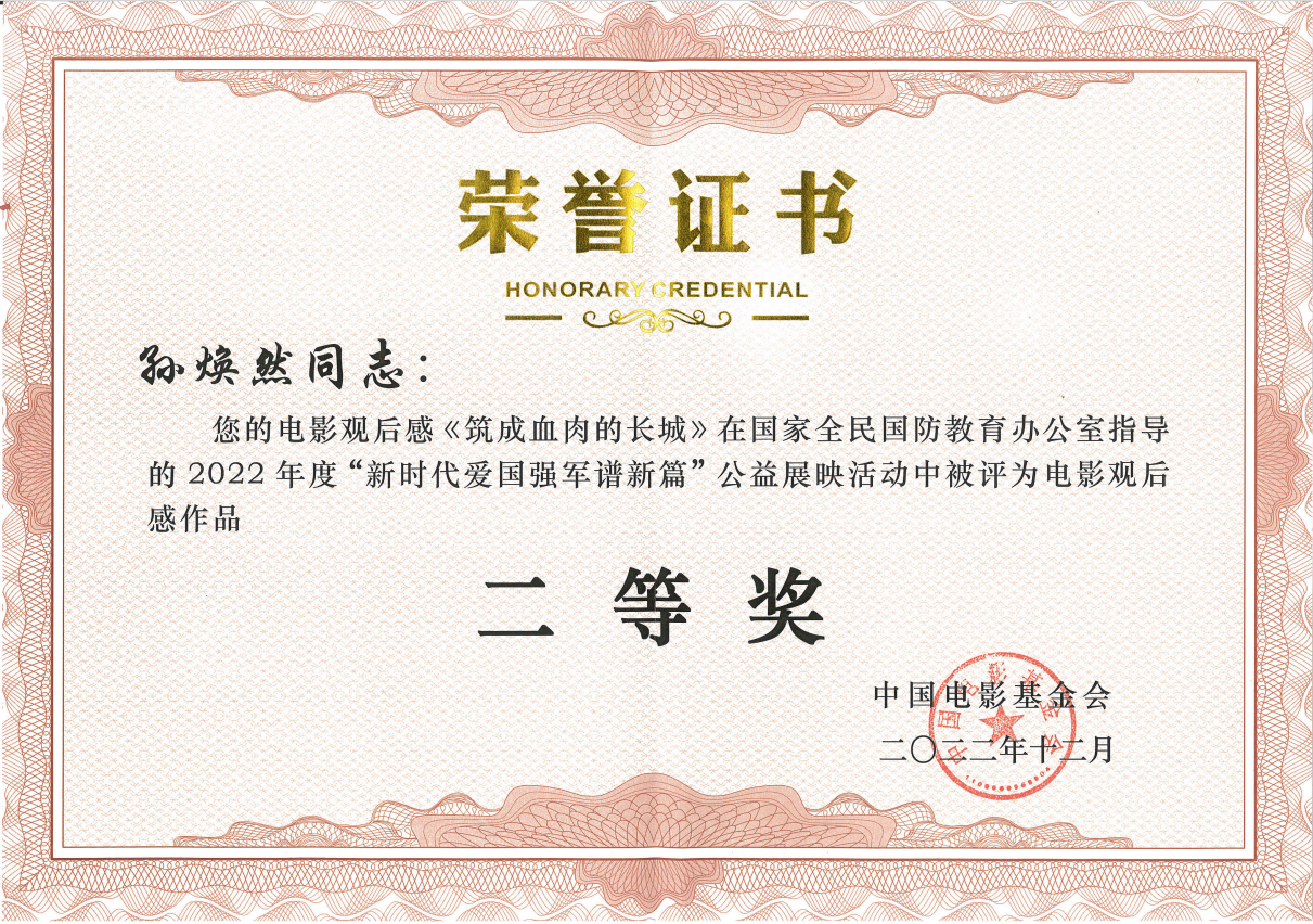 为深入学习贯彻习近平新时代中国特色社会主义思想,进一步加强大学生国防教育,丰富国防教育载体、方式和内容,语言文化学院(国际交流学院)积极组织学生参加了由国家全民国防教育办公室指导、中国电影基金会举办的“全民国防教育万映计划”之“新时代爱国强军谱新篇”公益展映活动。本次活动由学院辅导员周占军担任指导教师,组织学生认真撰写电影观后感。最终,赵培伦的《红海行动》观后感、孙焕然的《筑成血肉的长城》两篇作品荣获全国二等奖。