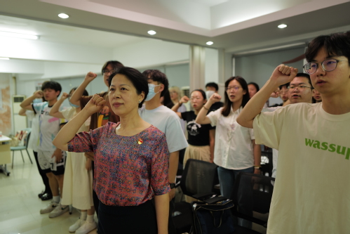 入党宣誓仪式在《国际歌》中拉开帷幕。与会党员在姚善英的带领下,面向党旗、举起右手,庄严宣誓:“我志愿加入中国共产党,拥护党的纲领,遵守党的章程……随时准备为党和人民牺牲一切,永不叛党。”铿锵有力、掷地有声的宣誓声久久回荡,表达了新发展党员对党的无限忠诚和为共产主义事业奋斗终身的坚定信念。随后,姚善英为新发展党员发放《中国共产党章程》,佩戴党徽,希冀每位党员同志牢记入党誓词,践行入党初心,做到组织上入党一生一次,思想上入党一生一世。