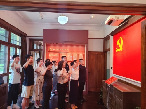 随后,师生党员来到复旦大学《共产党宣言》展示馆(陈望道旧居),通过视频、图画、文物等形式全面了解陈望道先生传奇的一生,重温真理的味道,触摸信仰的力量,深刻感悟先辈们对真理与信仰的不懈追求。在姚善英的带领下,师生党员举起右手,面向党旗,重温入党誓词。