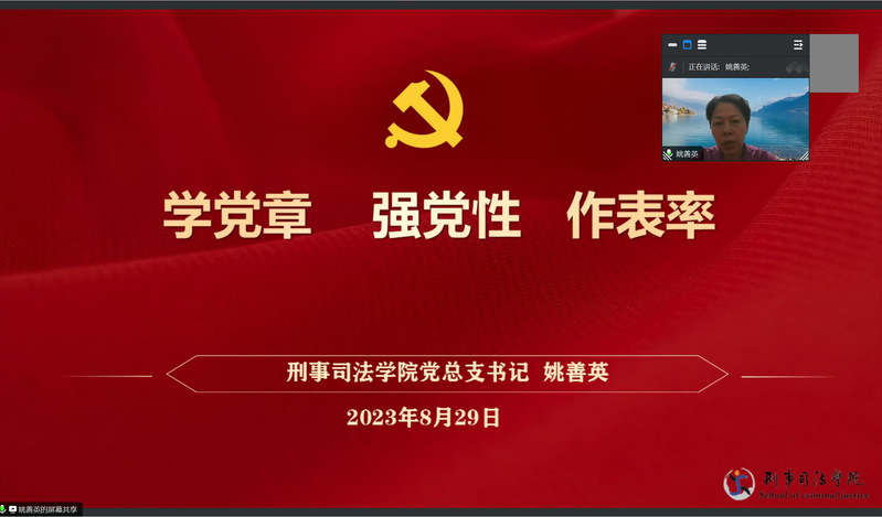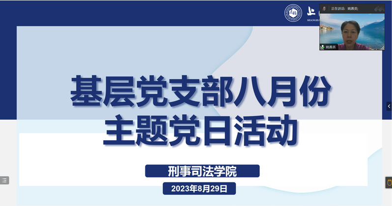 为严格落实“三会一课”制度,指导基层党支部把学习贯彻习近平新时代中国特色社会主义思想主题教育专题组织生活会开展好,8月29日晚,刑事司法学院于线上召开基层党支部8月份主题党日活动,全院师生党员参加会议。会议由刑事司法学院纪检监察学院党总支书记姚善英主持。