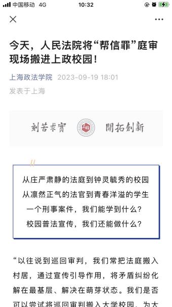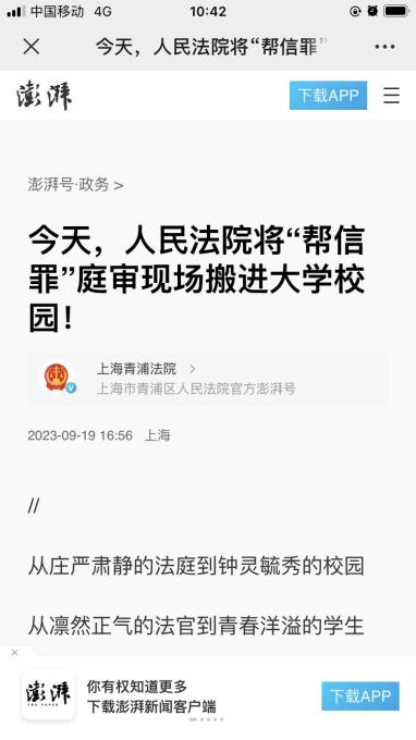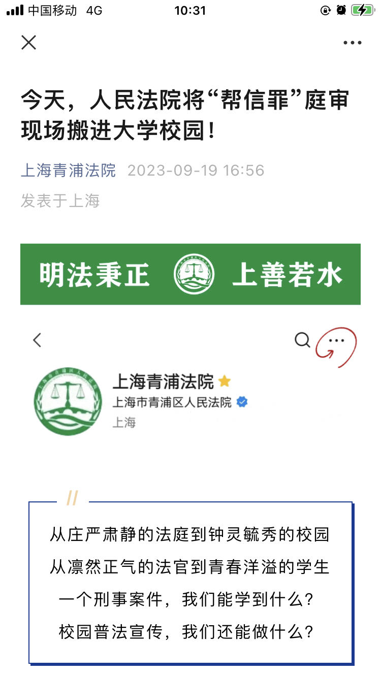 青浦区法院领导和法官们精心挑选与大学生学习生活紧密相关,又能“寓教于审”的案件;法院和学校仔细排查了安全风险,保障庭审程序和秩序,最终将巡回审判搬进大学。300余名上政师生“零距离”“全景式”观摩了庭审。