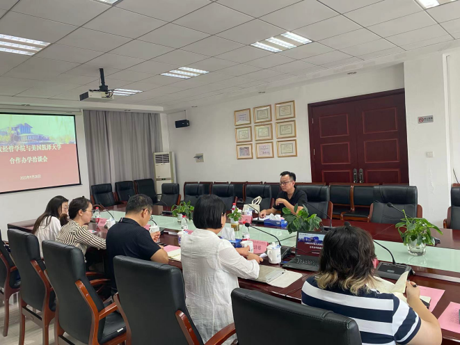 为进一步推进合作办学具体事宜,9月28日,经济管理学院与美国凯泽大学相关代表在A3-201会议室召开合作办学洽谈会。经济管理学院院长刘志强,美国凯泽大学国际学术事务院长Gavin Chen (Dean of Shanghai Off-Campus Location),国际交流处国际交流项目管理科科长王瑶、外专引智主管姚珺珺,经济管理学院外事助理张洁瑶、留学生教学行政助理曾奇麒出席会议。