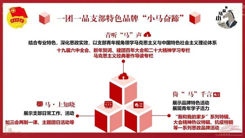 马院21201团支部在学院党总支的领导和学院团委的关怀下,依托“小马奋蹄”支部特色品牌,坚持以服务中心大局为核心,以引领力、组织力、贡献度为抓手的“三环一心”工作模式,从思政引领、集体建设、组织制度、作用发挥四个维度出发,不忘初心、牢记使命,踔厉奋发、勇毅前行。
