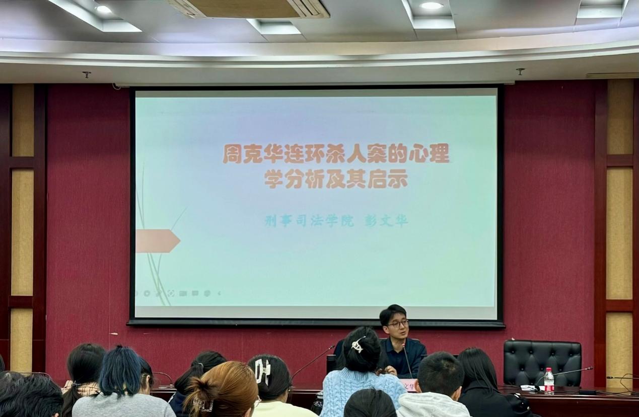 11月8日晚,新生系列讲座法学第五讲在汇知楼107开讲,刑事司法学院、纪检监察学院院长彭文华教授为2023级新生作题为“周克华连环杀人案的心理学分析及其启示”学术讲座,近200名师生现场聆听。讲座由教务处副处长曾智平主持。