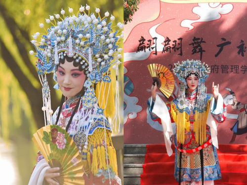 开幕式结束,服饰及舞蹈展示活动正式开始。在“泱泱国风,共享霓裳”篇章,代表国粹的京剧剧目《贵妃醉酒》让中外师生叹为观止,身着明朝琵琶袖比甲马面的琵琶乐手,一曲《十面埋伏》令台下观众赞叹不绝。在“环球异彩”篇章,萨尔瓦多传统大摆裙、泰国隆基筒裙、蒙古袍、索马里长袍等服饰及风格各异的民族舞蹈,则为同学们奉上一场视觉文化盛宴。