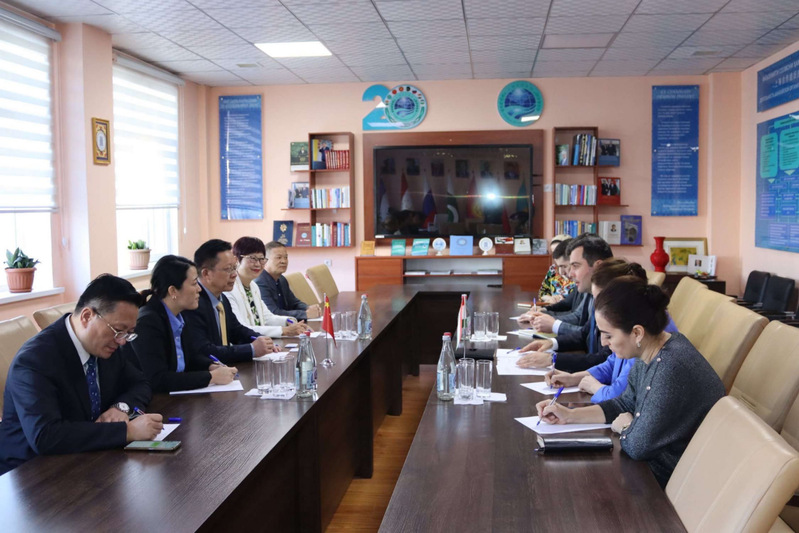 在塔吉克斯坦,塔吉克斯坦总统国家行政学院国际事务副校长伊斯玛佐达·索蒙先生亲切接待了我校代表团。索蒙副校长向我校代表团详细介绍了该校的基本情况,并对今年9月份我校上合组织法律大学联盟论坛的成功举办表示祝贺。塔吉克斯坦总统国家行政学院研究生处处长萨义德穆赫多罗夫、国际联络处主任依科洛莫娃、上合组织合作友好中心副主任托舍夫、外交与政治系主任沙里夫霍贾耶娃、法律系副系主任达夫拉比·伊扎图拉耶娃参与了会面。