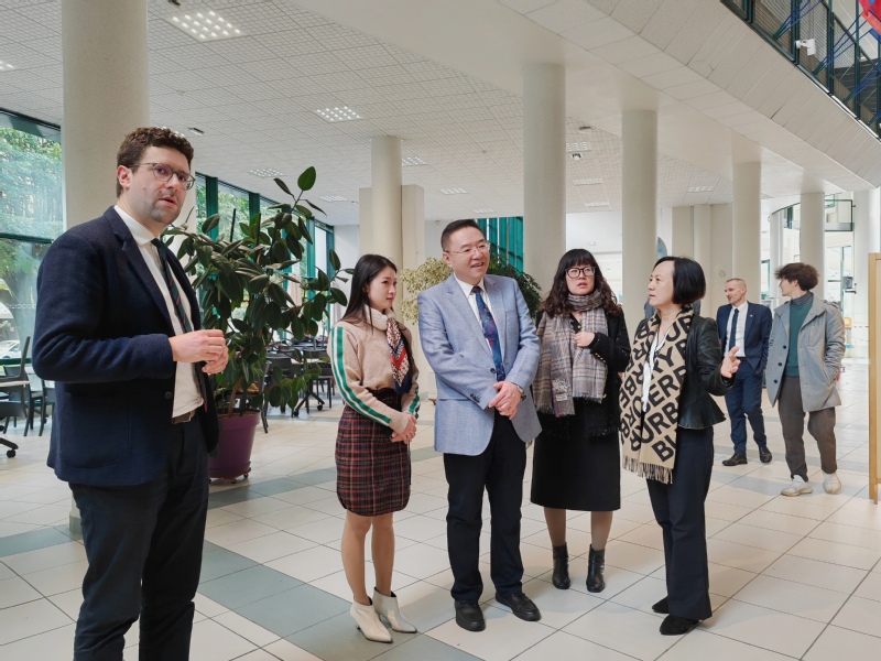 旺代天主教大学法律与经济学院院长Eric Pomès、国际交流处处长Matthieu Grandpierron陪同代表团参观校园。代表团实地考察了该校教室、餐厅、学生活动室、图书馆、会场等场所或设施,对该校处处体现以学生为本的办学理念印象深刻。