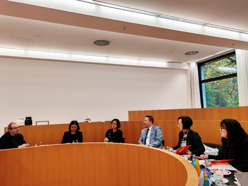 在法兰克福大学法律与金融学院,代表团与该学院副院长Rolf Friedwald(安林博士)、国际合作部主任Shen Dee Kobbelt、招生与市场主管Irene Xu进行了座谈。潘牧天介绍了我校基本办学情况、主要办学特色和留学生教育培养情况。该院副院长Rolf Friedwald介绍了法兰克福大学法律与金融学院的办学情况,招生与市场主管Irene Xu详细介绍了留学生培养项目。双方就深化合作深入交换了意见。目前我校已启动赴法兰克福大学法律与金融学院攻读金融硕士项目的校内选拔工作,入选学生有望于明年秋季进入法兰克福大学法律与金融学院学习。法兰克福发达的金融服务业为法律与金融专业人才培养提供了优质的实习实践平台和就业市场,是法兰克福大学法律与金融学院人才培养的重要依托和出口。该校依托行业市场培养专业人才,对我校深化相关专业应用型人才培养模式改革具有重要的借鉴意义。