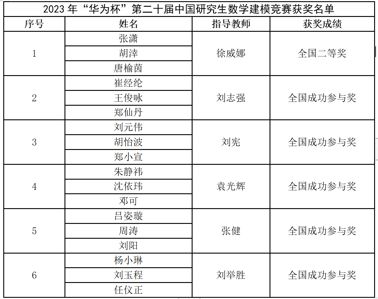 11月14日,2023年“华为杯”第二十届中国研究生数学建模竞赛成绩揭晓,我校经济管理学院研究生代表队荣获全国二等奖1项、成功参与奖5项,创下了我校研究生在该赛事中的最好成绩。