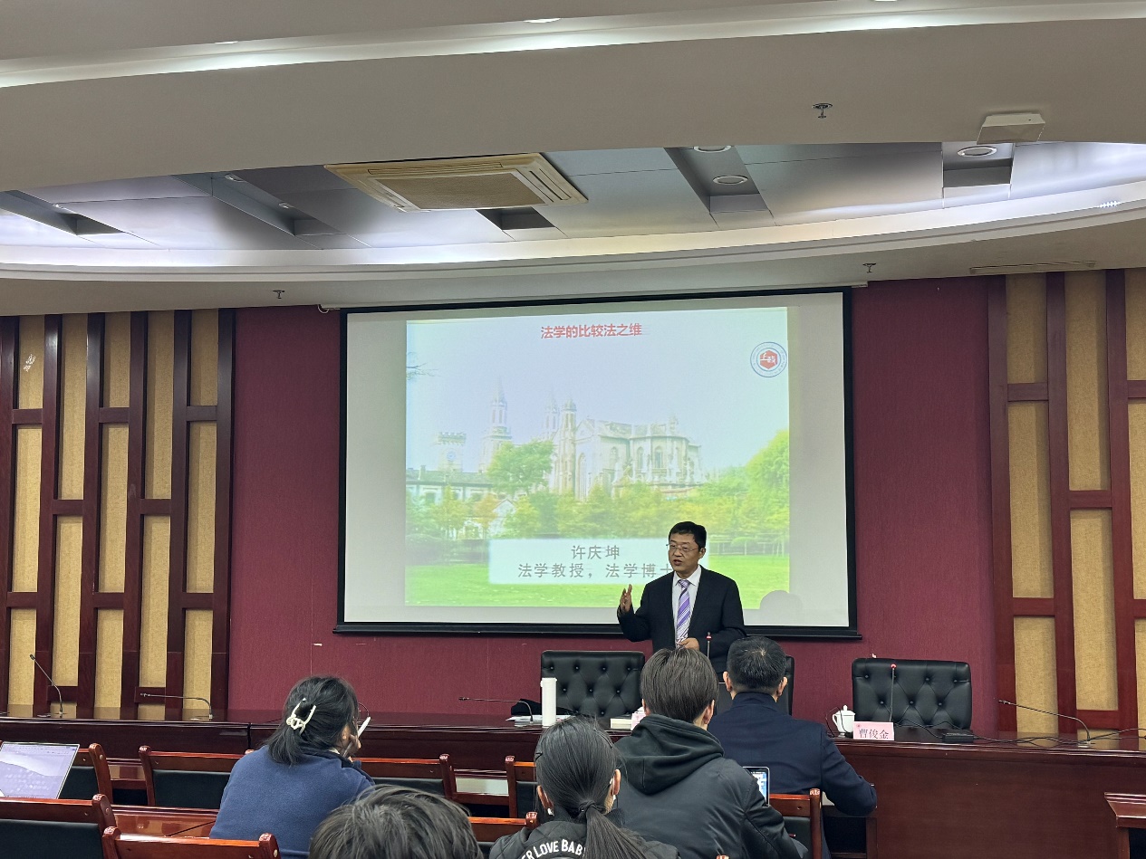 11月15日晚,新生系列讲座法学第六讲在汇知楼107开讲,国际法学院教授许庆坤为2023级新生作题为“法学的比较法之维”讲座,近百名师生现场聆听。讲座由国际法学院曹俊金副教授主持。