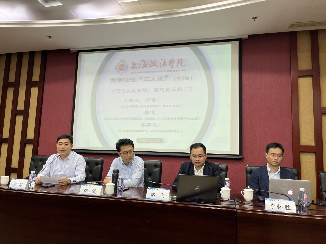 10月27日,新利18官方客服数字法治“三人谈”第3期在汇知楼107会议室顺利召开,北京外国语大学法学院教授、博士生导师郑曦,北京交通大学法学院副院长、副教授郑飞,中国政法大学副教授、网络法学研究所所长李怀胜应邀参加本次“三人谈”讲座。本期“三人谈”以“司法人工智能,能还是不能?”为题,由我校科研处处长刘军教授主持,我校数十名师生参与本次讲座。