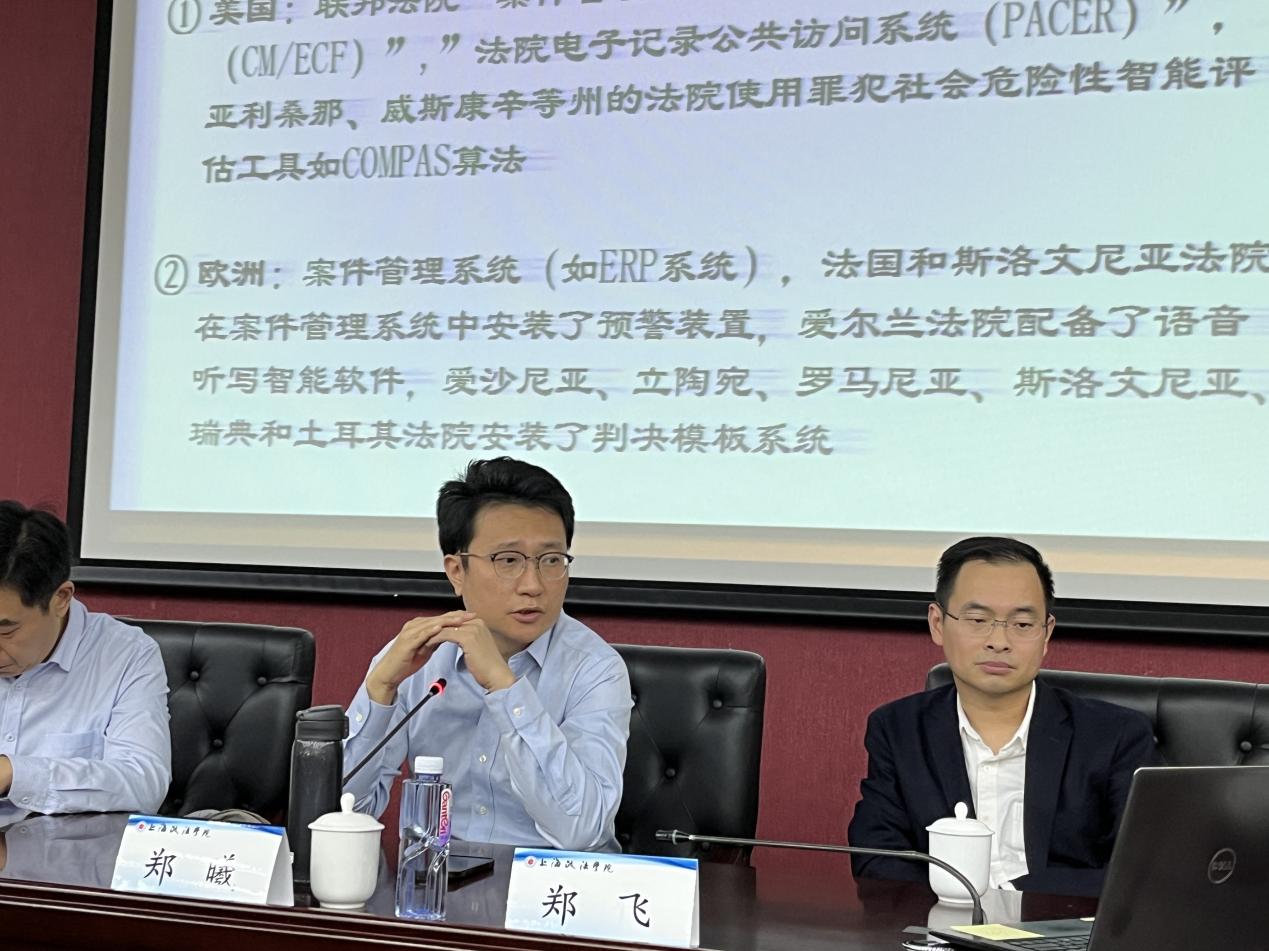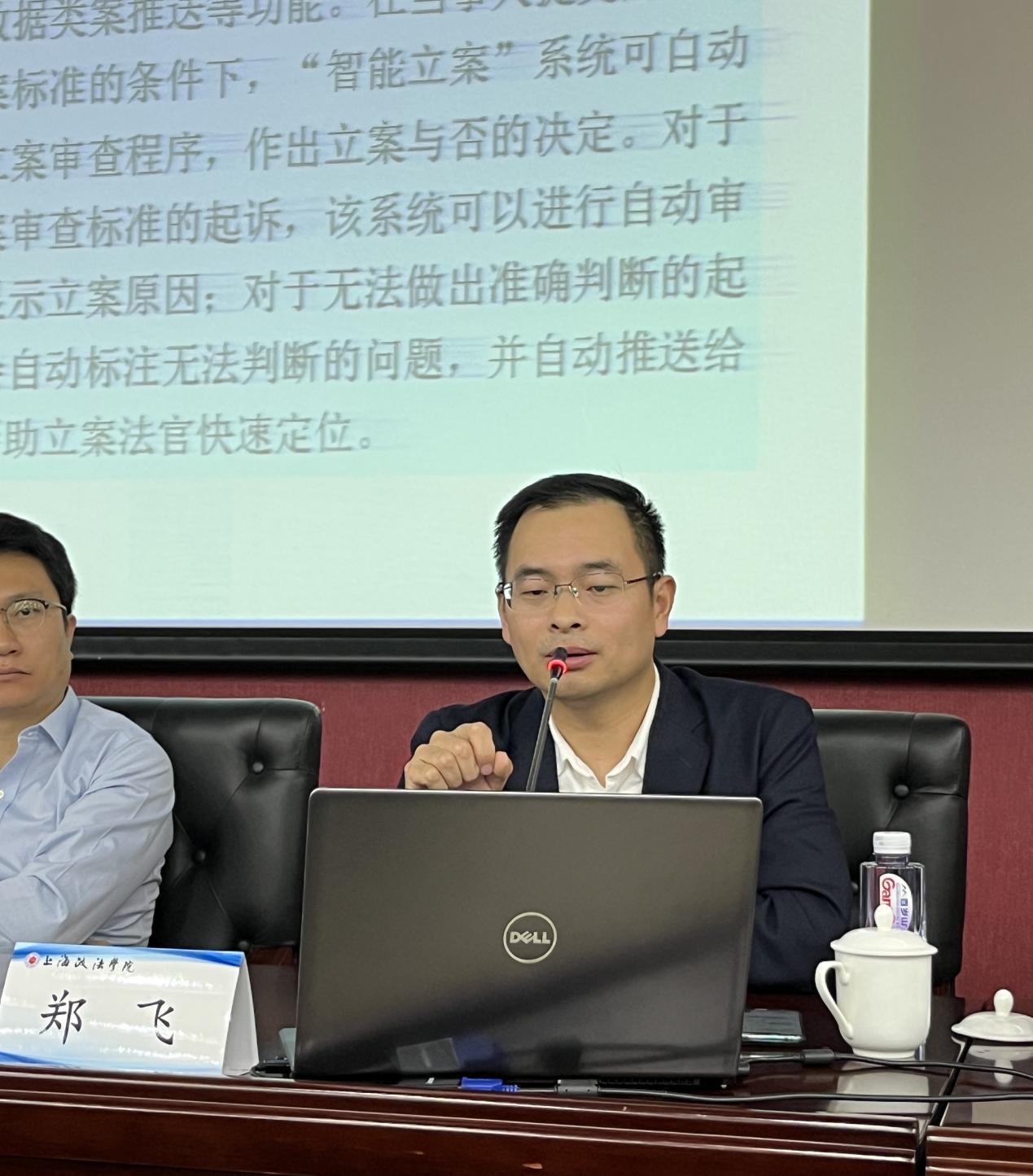郑飞先以《人工智能司法的能》为题作汇报,他指出司法人工智能正对“司法服务、智能立案、智能审前准备、智能证据分析、智能案件分析、司法活动流程智能化、智能司法协同、智能送达、智能检务”的赋能,并畅想了“人工智能法官、检察官、律师”的未来图景。