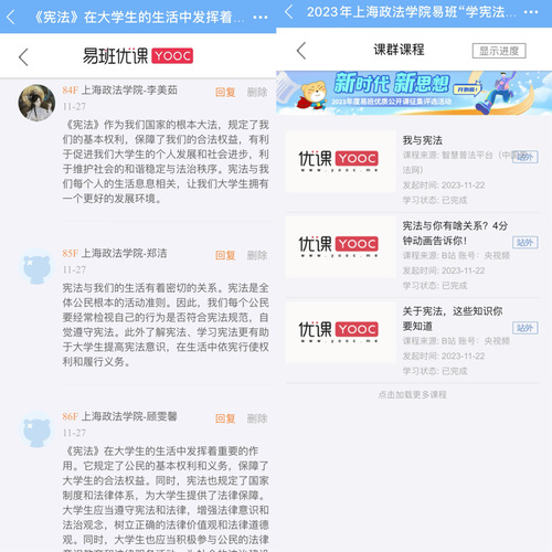 11月23日—12月15日,我校学生工作部易班活动中心通过“易班优课”平台在线上发布“宪法知识课堂”与“宪法知识问答”。同学们可以加入易班优课课程群,随时随地在【学习课程】中观看相关宪法知识普及课程,在观看完全部课程后参加【在线考试】“宪法知识竞答”。通过线上知识课堂与知识竞答相结合的方式不仅能够加深同学们对于知识的理解,也能够检验同学们对于宪法知识的掌握情况,提升学生的法律素养。