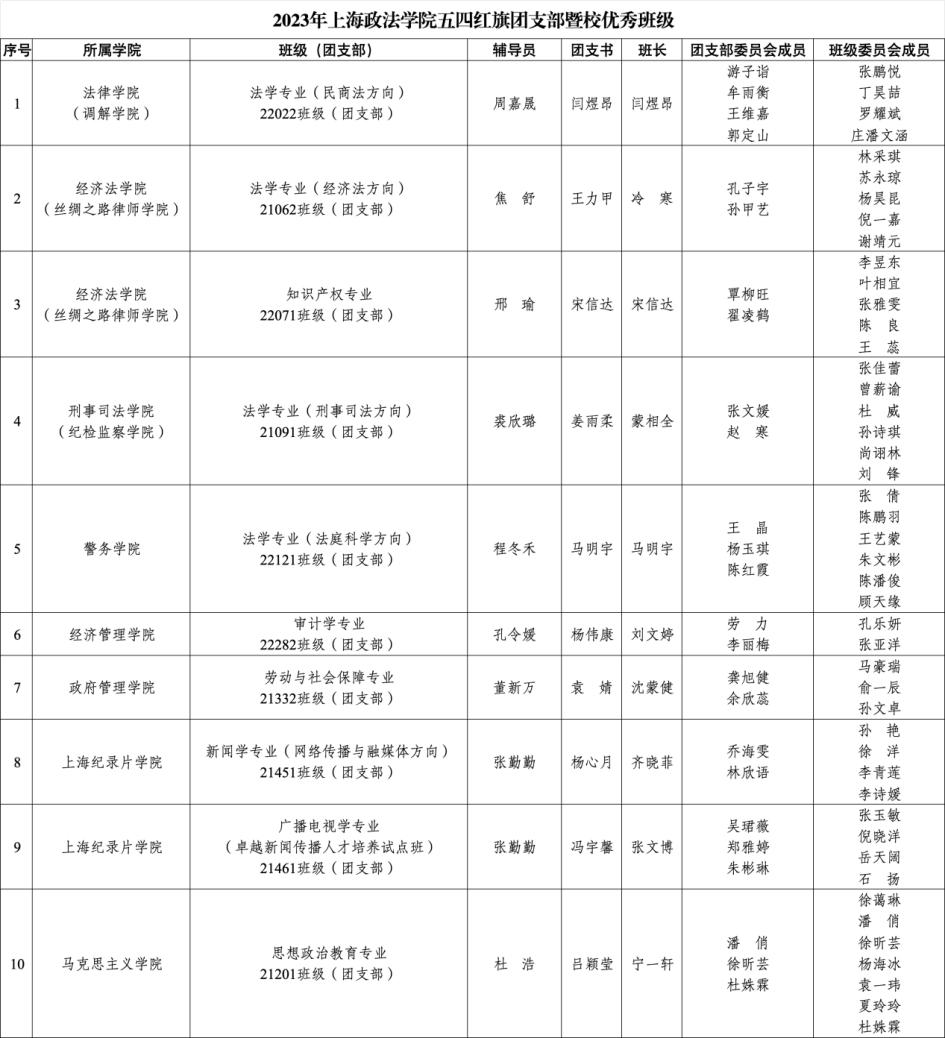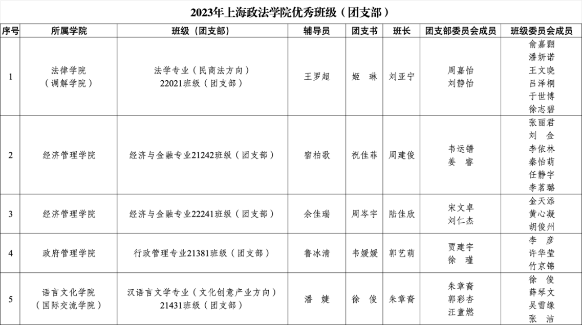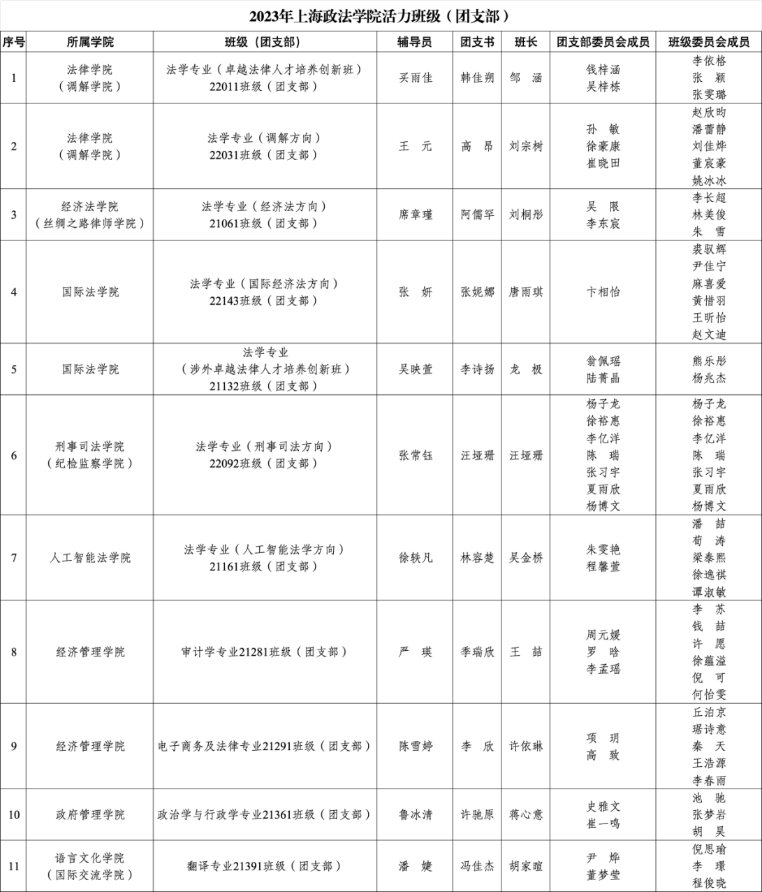 法律学院法学专业(卓越法律人才培养创新班)22011班级(团支部)、法律学院法学专业(调解方向)22031班级(团支部)、经济法学院法学专业(经济法方向)21061班级(团支部)、国际法学院法学专业(国际经济法方向)22143班级(团支部)、国际法学院法学专业(涉外卓越律师人才培养创新班)21132班级(团支部)、刑事司法学院法学专业(刑事司法方向)22092班级(团支部)、人工智能法学院法学专业(人工智能法学方向)21161班级(团支部)、经济管理学院电子商务及法律专业21291班级(团支部)、经济管理学院审计学专业21281班级(团支部)、政府管理学院政治学与行政学专业21361班级(团支部)及语言文化学院翻译专业21391班级(团支部)等11个班级(团支部)被评为2023年新利18官方客服活力班级(团支部)。
