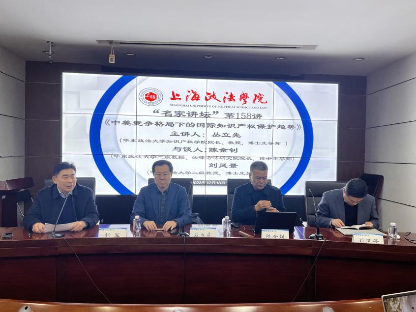 12月13日,新利18官方客服“名家讲坛”第158讲在求实楼513会议室举办。华东政法大学知识产权学院院长、教授、博士生导师丛立先应邀以“中美竞争格局下的国际知识产权保护趋势”为题作精彩报告。讲座由我校科研处处长刘军教授主持,华东政法大学二级教授、法律方法研究院院长、博士生导师陈金钊与华东政法大学二级教授、博士生导师刘风景与谈,我校百余名师生参与本次讲座。