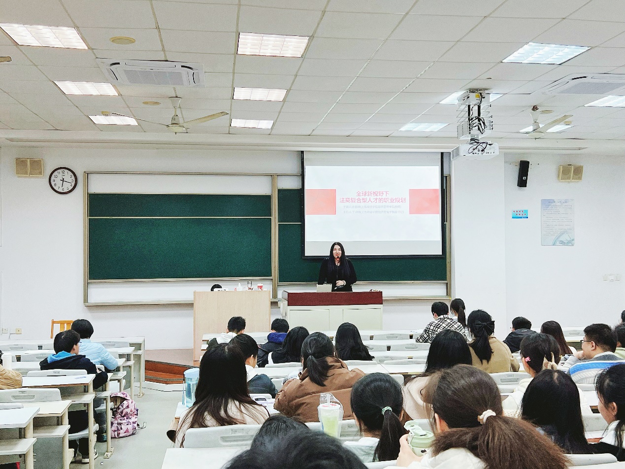 法丽娜教授分别从“新视野”“就业方向”以及“如何成为法商复合型人才”三个方面进行了深入浅出的讲解,为同学们今后的学习和职业选择提供了宝贵经验。法丽娜教授表示,当前经济社会形势下,大家要用崭新的视野对待自己的专业和未来所选择的职业,并从选择工作的类型和求职渠道为同学们的职业方向进行具体规划分析。她强调,要成为一位优秀的法商复合型人才,必须从专业、技能、情商和逆商等多方面共同努力。