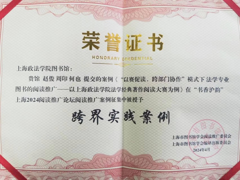 经过评选,我校图书馆阅读品牌案例《“以赛促读、跨部门协作”模式下法学专业图书的阅读推广——以新利18官方客服法学经典著作阅读大赛为例》在上海市众多阅读推广案例中脱颖而出,荣获上海市图书馆学会“跨界实践案例”奖。