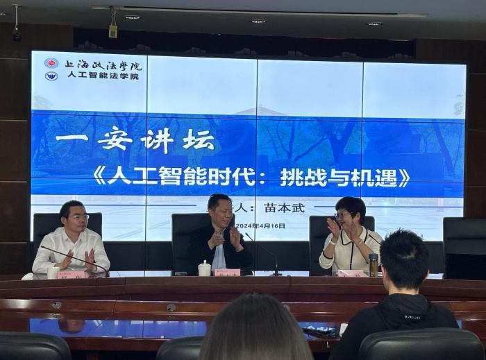 4月16日下午,由人工智能法学院主办的“一安讲坛”第二讲在求实楼开讲,雨本生物(上海)科技有限公司董事长苗本武先生应邀作“人工智能时代:挑战与机遇”的主题讲座。学院党总支书记王静主持讲座,院长杨华等近百名师生参加。