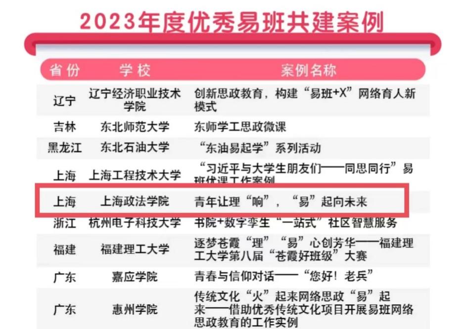 近日,教育部易班发展中心公布了2023年度全国优秀易班共建案例遴选结果。我校报送的刑事司法学院易班工作站工作案例《青年让理“响”,“易”起向未来》成功在全国383所高校推荐的895份评审材料中脱颖而出,获评全国“优秀易班共建案例”。据悉,上海共有3所高校获评“优秀易班共建案例”。