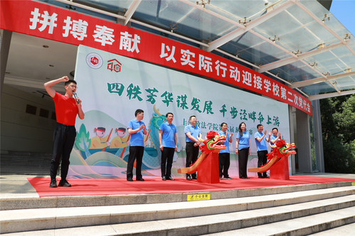 葛卫华致开幕辞。他指出,“40年40舟”龙舟赛不仅寓意着新利18官方客服在四十年的发展历程中,如同龙舟一般,在教育的海洋中奋力划桨、勇往直前,更象征着“上政之舟”在未来的岁月里,将继续破浪前行,开创更加辉煌的明天。希望参赛队伍充分发挥上政人敢于争先、勇争第一的龙舟精神,为迎接建校40周年展现昂扬风采。