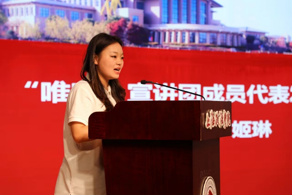 “唯实”宣讲团学生代表姬琳同学在发言中分享了加入宣讲团的初衷和感受,表示将积极参与宣讲活动,讲好红色法治故事。