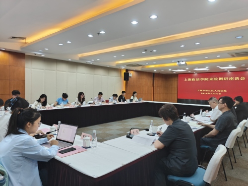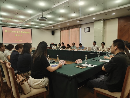 上海市松江区是长三角“G60科创走廊”的策源地和牵头城区,松江法院更是今年调研的驱动联系单位。7月23日下午,调研组第一站来到松江法院,受到了松江法院领导和法官们的热情接待。座谈会上,松江法院副院长唐震对松江法院前不久举行的法治化营商环境专题会议进行了回顾,并围绕典型商事案例、知识产权保护、金融板块纠纷、涉外商事纠纷解决、法治化营商环境考评及其特色亮点工作和创新举措等六个方面进行了详细介绍。商事审判庭副庭长顾国华、刑事审判庭副庭长房素平和民事审判团队长王平、纪检室主任黄莺等庭室负责人结合典型案例、统计数据、企业合规和司法建议等,对科创走廊松江区的司法保障情况进行了翔实介绍。我校师生就法治化营商环境的相关问题同法官们进行了深入交流与讨论,双方还就联合召开科创走廊九城区协同大会、合作共建上政实习基地和上政调解工作室等院校深度持续合作事宜进行了充分沟通。