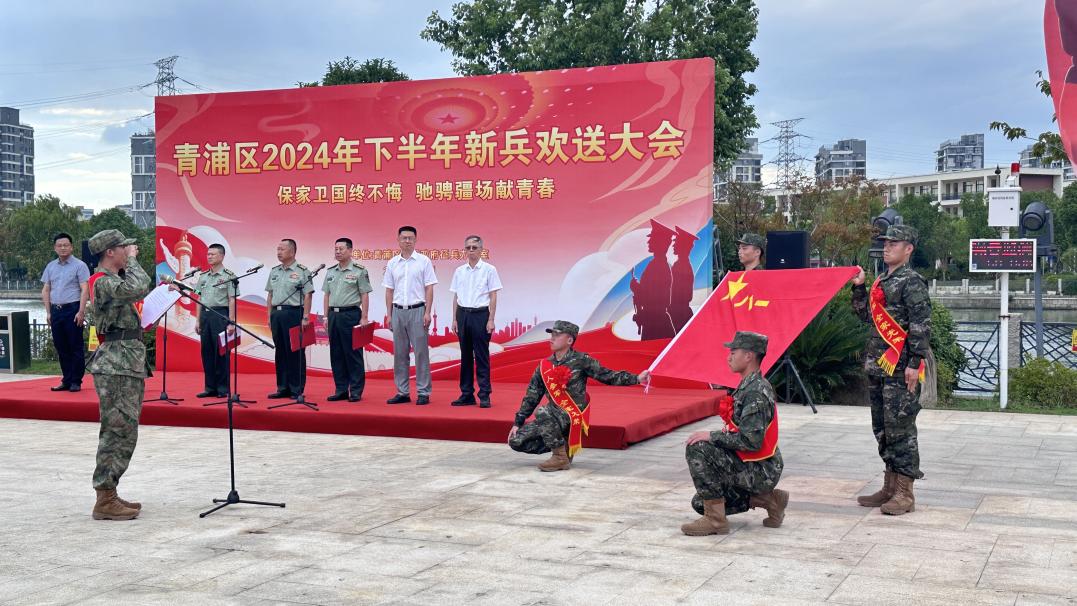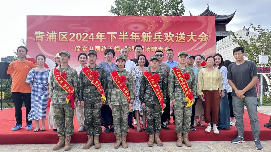 9月18日下午,青浦区人民武装部在水城门举行2024年下半年新兵欢送会。学生工作部、人民武装部部长丁永建,入伍新兵辅导员代表及部分学生家长参加欢送会,欢送光荣参军入伍的5名上政学子。