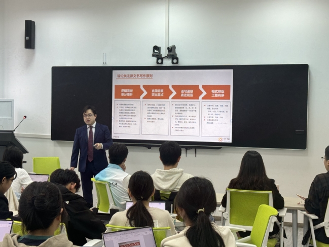 温晗律师以其十一年的商事领域从业经验,为同学们带来了一堂生动实用的诉讼法律文书写作课程。他详细讲解了法律文书的结构、语言风格、逻辑推理以及如何有效表达法律观点。温律师强调,法律文书是专业素养和逻辑思维能力的直接体现,因此撰写时应遵循逻辑清晰、言简意赅、表达规范以及工整有序的原则。他还分享了自己在处理复杂案件时的文书写作技巧,这些宝贵的经验让学生对法律文书的撰写有了更深入直观的理解。
