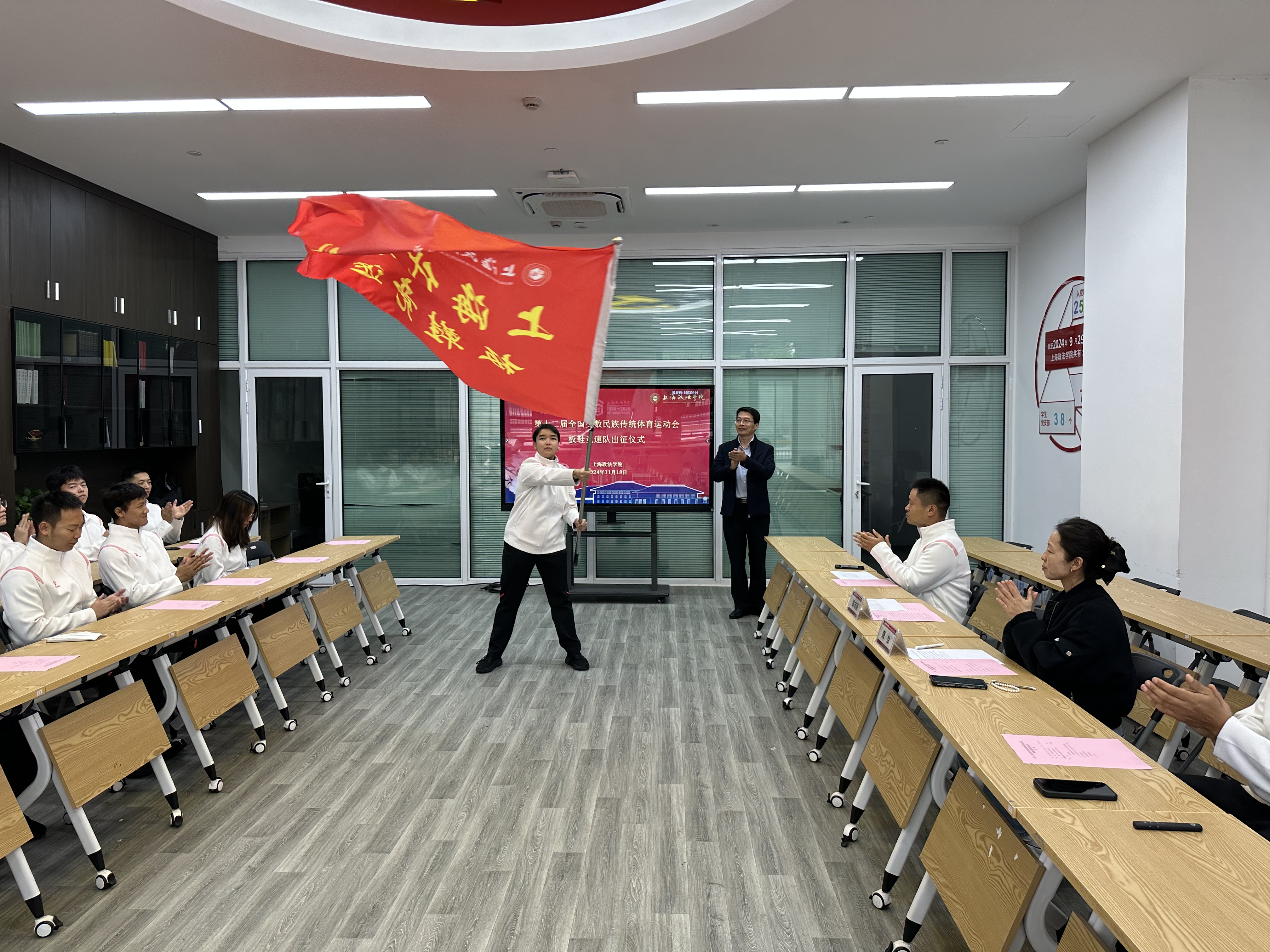 高志刚为运动员代表拜尔娜授旗并赠送出征物资。他充分肯定了运动员们的精神风貌,并向各位同学的辛勤付出表示感谢。他表示,全国少数民族传统体育运动会是由国家民委和国家体育总局联合主办的大型综合性体育运动会,我校此次代表上海参加板鞋竞速项目,既是一份荣耀,也是一份责任。希望大家提高站位,凝聚共识,以强烈的责任感和使命感迎接接下来的挑战。尊重对手,文明参赛,展现良好的体育道德风尚和上政学子的昂扬风貌。传承文化,增加友谊,成为传播民族文化、增进各民族间友谊的使者。