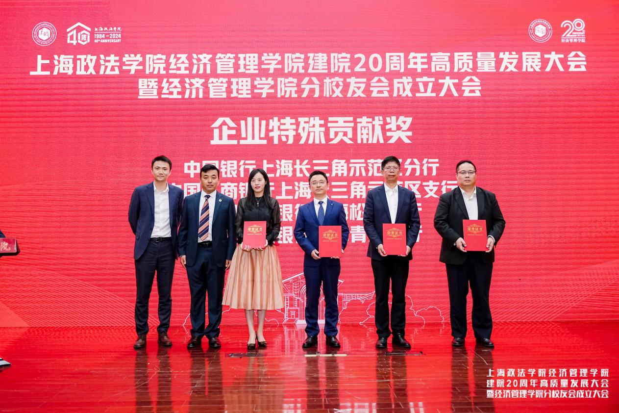 大会为中国银行上海长三角示范区分行、中国工商银行上海长三角示范区支行、中国农业银行上海松江支行、泰隆商业银行上海青浦支行颁发了企业特殊贡献奖。