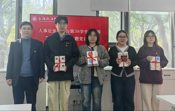 毛军权向上政第38学生党支部学生代表赠送学科专业和职业生涯发展规划书籍,并勉励大家要多读书、读好书、善读书,提升人生品位,丰富精神世界。学生党支部代表陈彦文、韩承裕分享了进博会志愿者心得。他们表示,服务进博会不仅提升了自身的实践能力,更坚定了服务社会的信念。活动中,大家还一起观看了《大力弘扬教育家精神》宣传视频。