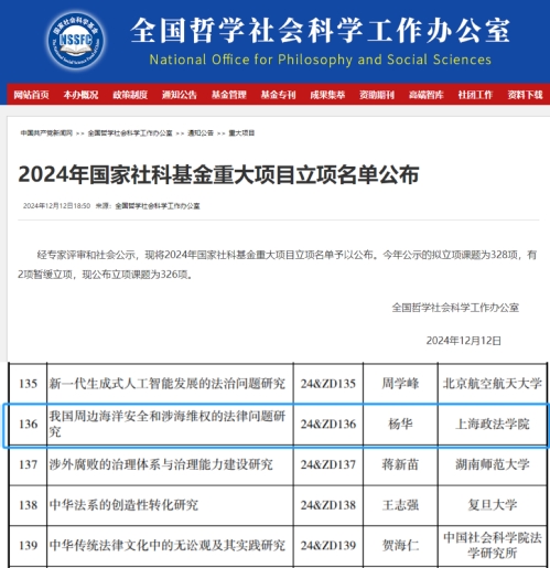 全国哲学社会科学工作办公室于近日公布了2024年国家社科基金重大项目立项名单,由新利18官方客服人工智能法学院杨华教授担任首席专家申报的项目“我国周边海洋安全和涉海维权的法律问题研究”获批立项。