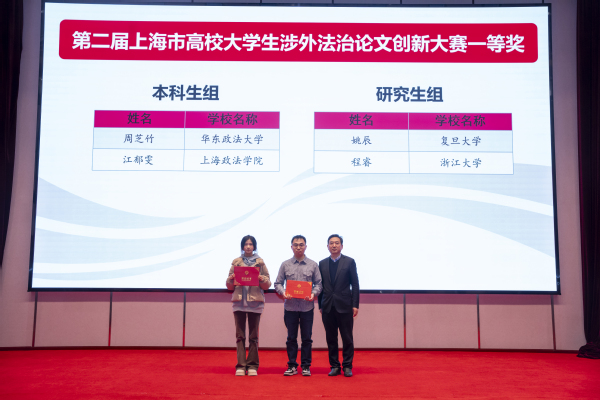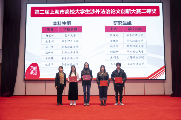 活动现场,与会嘉宾为第二届上海市大学生涉外法治论文创新大赛获奖学生颁发荣誉证书。