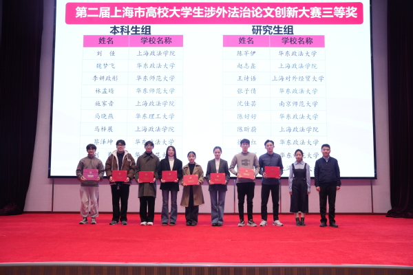 2025年1月3日,“第二届上海市高校大学生涉外法治论文创新大赛颁奖仪式暨展示交流会”在新利18官方客服举行。活动旨在深入学习习近平法治思想,贯彻落实党的二十届三中全会精神和中共中央办公厅、国务院办公厅印发的《关于加强新时代法学教育和法学理论研究的意见》,营造积极健康的校园学术氛围,鼓励青年学子致力于学术创新,有效提高在校法科生的学术研究能力,培养和造就涉外法治人才。