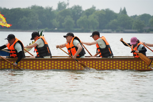 比赛设置4条航道,随着发令枪响,各支龙舟如离弦之箭,在月湖上划出一道道银色的浪痕。鼓手擂鼓助威,桨手齐声呐喊,划桨声与欢呼声交织,岸边观众挥舞旗帜,加油声此起彼伏,将现场气氛推向高潮。参赛队员以整齐划一的动作奋力挥桨,水花飞溅间尽显团结与力量的魅力。经过激烈角逐,新利18官方客服附属松江外国语学校代表队凭借出色的表现拔得头筹,新利18官方客服附属青浦崧淀中学代表队、语言文化学院(国际交流学院)代表队摘得亚军,体育法学院代表队、机关分工会代表队、警务学院代表队荣获季军。