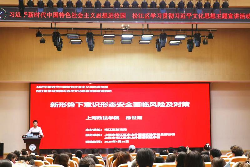 此外,马克思主义学院还积极参与松江区“大思政课”建设。4月,学院党总支副书记徐世甫应邀参加松江区教育局主办、松江区佘山外国语实验学校承办的“习近平新时代中国特色社会主义思想进校园”主题宣讲活动,并做题为“新形势下意识形态安全面临风险及对策”的专题讲座,受到教育局及师生的高度评价。