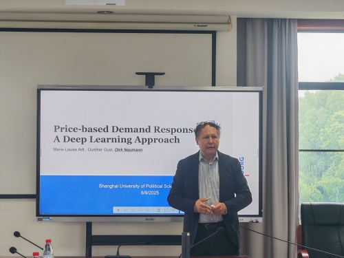 来访期间,诺伊曼教授做题为“基于价格的需求响应——深度学习方法”(Price-based Demand Response A Deep Learning Approach)的学术讲座并与学院教师开展交流座谈。他着重介绍了一种旨在通过在线调整电价来缓解电网拥堵的需求响应(DR)程序,该程序基于观察到的总电力消费进行调整,以应对非弹性和时间不相关的电力需求。该模型为学院师生带来了新的思路和启发,与会师生针对该模型在经济学方向和统计模型分析方面的应用同诺伊曼教授进行了热烈的讨论。