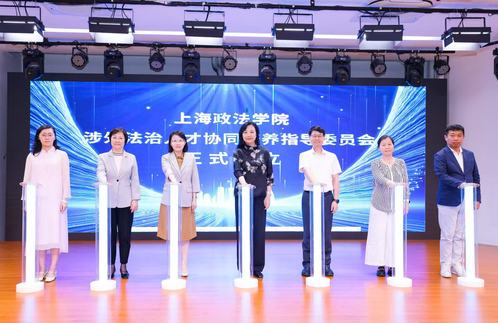 在热烈的掌声中,上海市第三中级人民法院党组成员、政治部主任吴浩波,上海市浦东新区人民检察院党组成员、副检察长施净岚,上海市浦东新区司法局立法事务处(涉外法治处)处长张玥,上海市浦东新区人民法院政治部副主任严剑漪,上海仲裁委员会常务副主任范铭超,以及中国海事仲裁委员会上海总部副秘书长徐飞等共建实务部门代表与刘晓红校长共同为涉外法治人才协同培养指导委员会揭牌。副校长郑少华宣读了涉外法治人才协同培养指导委员会成员名单,教务处处长赵运锋主持揭牌仪式。