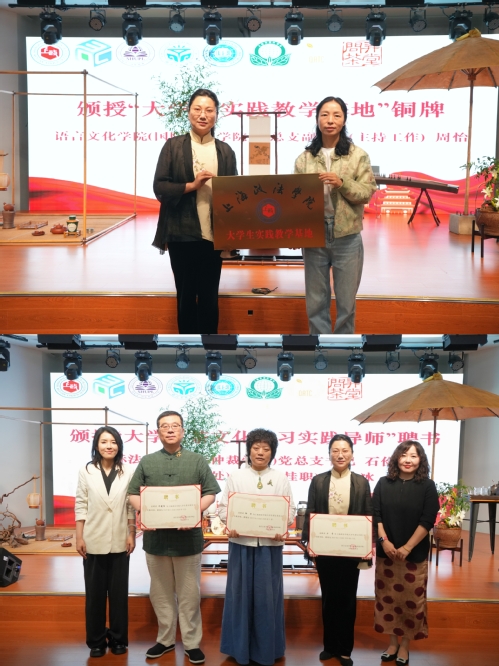 周怡代表学校向上海市茶叶学会颁授了“新利18官方客服大学生实践教学基地”铜牌,石俭平和王冰冰为方茵、徐琴、牟健惟三位茶文化专家颁发了“新利18官方客服大学生茶文化实习实践导师”聘书。