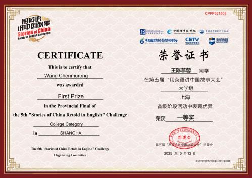 第五届“用英语讲中国故事大会”上海省级阶段比赛于近日圆满收官。经过激烈角逐,我校语言文化学院(国际交流学院)英语23401班王陈慕蓉同学(指导教师:王春荣)凭借出色表现,从上海300余名重点高校选手中脱颖而出,荣获省级阶段大学组一等奖,向世界展现了当代中国青年的文化自信与语言风采。
